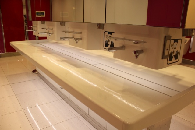 1. No bowl sinks. Instead there is a slab that slants towards the middle and the water automatically just gets rolled off and collected in the slightly depressed center part of the structure. No problem of the water spilling outside the bowl and creating a wet mess. You also don’t have to move your hands up and down trying to position them just so in front of the motion sensor for the tap to work. The tap is at a comfortable height and yet not too high for water to bounce off the slab on your clothes.