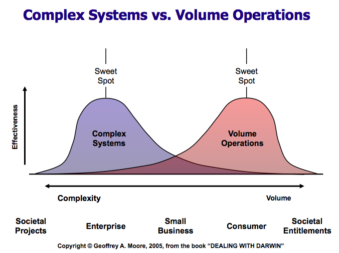 Geoffrey Moore, in his book Dealing with Darwin, talks about two fundamental business architectures as means of creating value: Complex Systems and Volume Operations. Moore defines them as follows: